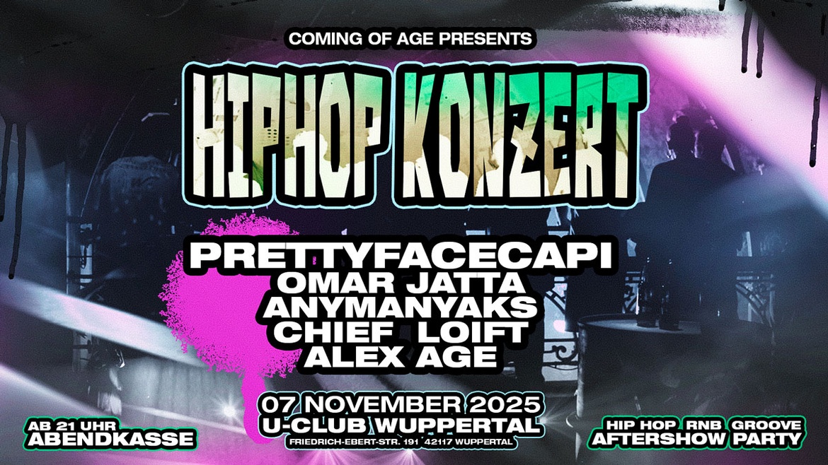 Auf der Bühne: Prettyfacecapi, Omar Jatta, Anymanyaks, Alex Age & Chief Loift – ein starkes Line-Up aus NRW, das zeigt, wie vielfältig Hip-Hop sein kann. Wuppertal hat lange auf so ein Event gewartet – jetzt sind wir am Start.